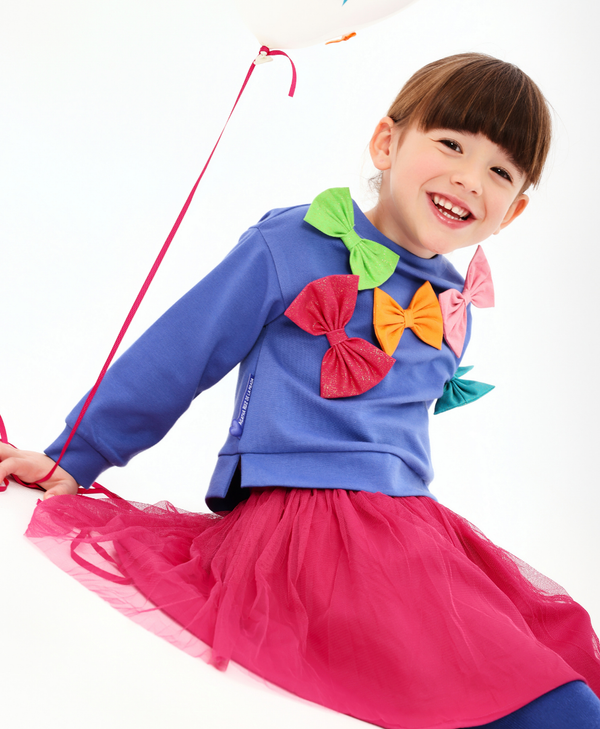 CONJUNTO SUDADERA LAZOS AZUL ELECTRICO Y FALDA FUSCIA CON LEOTARDOS